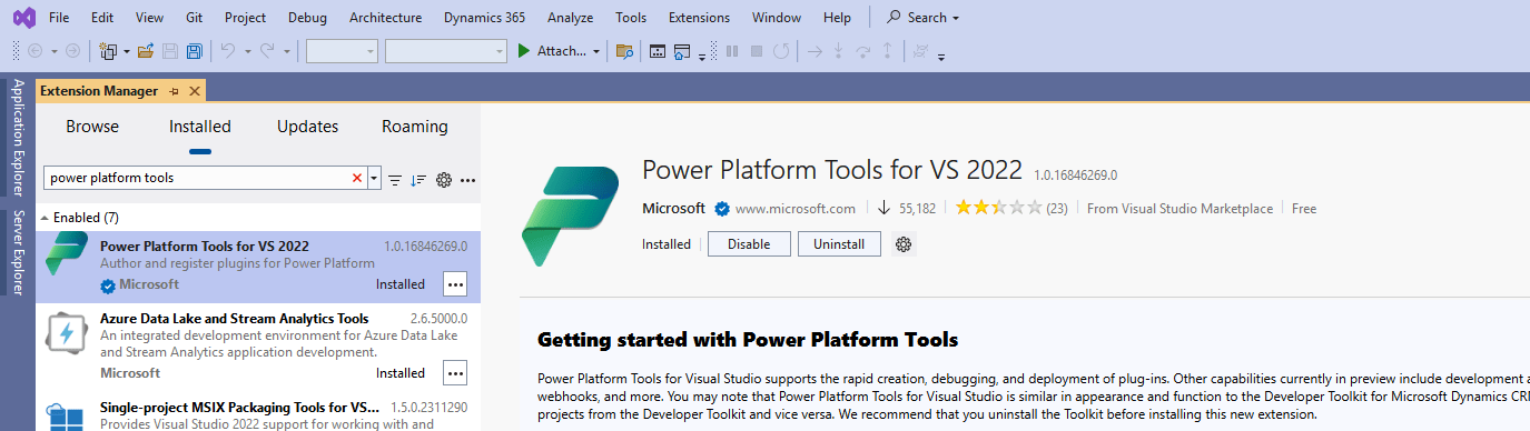 Before proceeding with the installation of Docentric on a UDE (Unified Developer Experience) environment, please make sure that the Power Platform Tools for VS extension is installed inside Visual Studio: