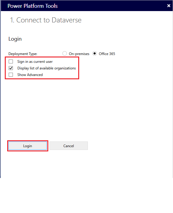 - Only check the Display list of available organizations checkbox and click Login: