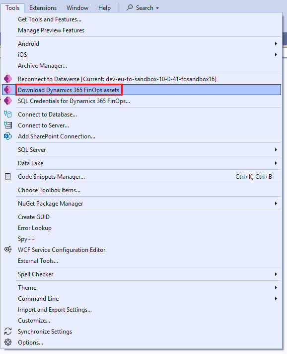 - Click on Tools > Download Dynamics 365 FinOps assets: