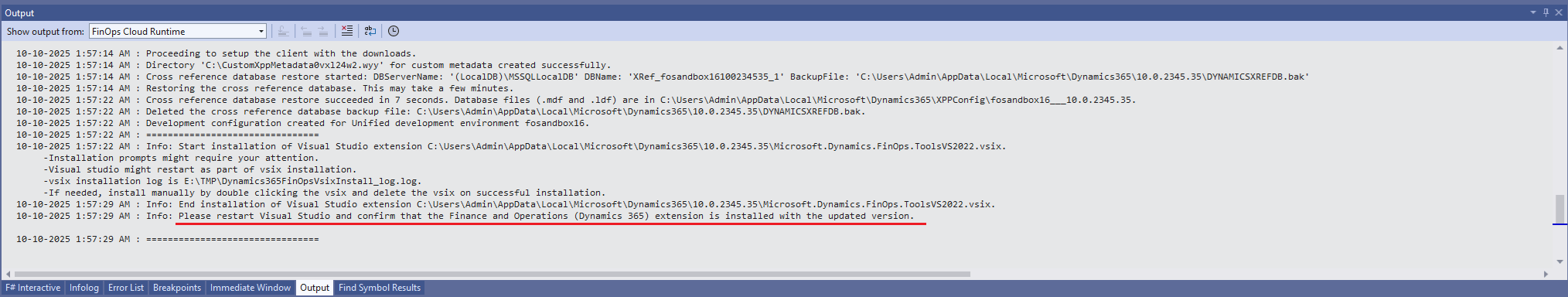 - Navigate to the Output window in Visual Studio to track the progress of the download: