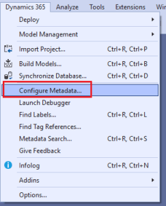 - Click on Dynamics 365 > Configure Metadata (note that the Dynamics 365 menu item can also be hidden inside the Extensions menu item):