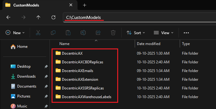 12345678910111213# Core modelsC:\Users\Admin\AppData\Local\Microsoft\Dynamics365\10.0.2345.35\PackagesLocalDirectory\bin\ModelUtil.exe -import -metadatastorepath="C:\CustomModels" -file="C:\temp\DocentricAX\Docentric AX.axmodel"C:\Users\Admin\AppData\Local\Microsoft\Dynamics365\10.0.2345.35\PackagesLocalDirectory\bin\ModelUtil.exe -import -metadatastorepath="C:\CustomModels" -file="C:\temp\DocentricAX\Docentric AX Extension.axmodel"C:\Users\Admin\AppData\Local\Microsoft\Dynamics365\10.0.2345.35\PackagesLocalDirectory\bin\ModelUtil.exe -import -metadatastorepath="C:\CustomModels" -file="C:\temp\DocentricAX\Docentric AX Emails.axmodel"# Warehouse Labels modelC:\Users\Admin\AppData\Local\Microsoft\Dynamics365\10.0.2345.35\PackagesLocalDirectory\bin\ModelUtil.exe -import -metadatastorepath="C:\CustomModels" -file="C:\temp\DocentricAX\Docentric AX Warehouse Labels.axmodel"# SSRS Replicas modelC:\Users\Admin\AppData\Local\Microsoft\Dynamics365\10.0.2345.35\PackagesLocalDirectory\bin\ModelUtil.exe -import -metadatastorepath="C:\CustomModels" -file="C:\temp\Model - Docentric AX SSRS Replicas\Docentric AX SSRS Replicas.axmodel"# CBD Replicas modelC:\Users\Admin\AppData\Local\Microsoft\Dynamics365\10.0.2345.35\PackagesLocalDirectory\bin\ModelUtil.exe -import -metadatastorepath="C:\CustomModels" -file="C:\temp\Model - Docentric AX CBD Replicas\Docentric AX CBD Replicas.axmodel" - When the commands are run succesfully, the models will be installed in the custom metadata folder: