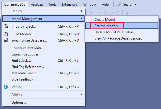 - Refresh the list of installed models by clicking on Dynamics 365 > Model Management > Refresh Models: