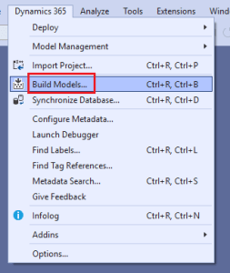 In Visual Studio select the »Dynamics 365 -> Build Models...« menu. In the Model Build dialog select the newly imported models and press the Build button.