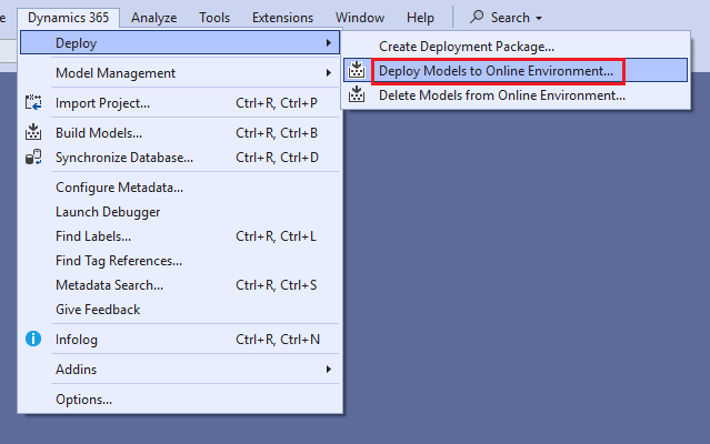 - Click on Dynamics 365 > Deploy > Deploy Models to Online Environment: