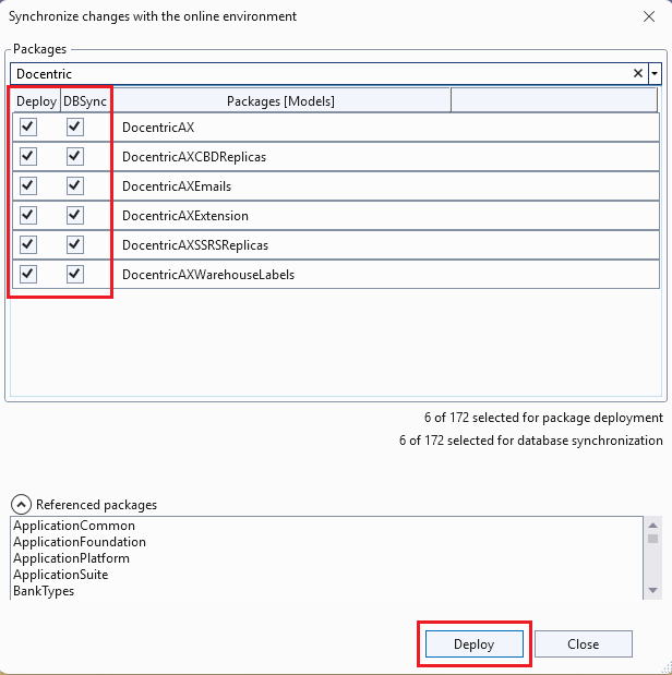 - Check the Deploy and DBSync options for all the Docentric AX models and click on Deploy: