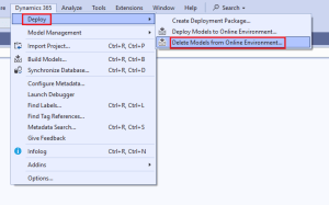 - Click on Dynamics 365 > Deploy > Delete Models from Online Environment (note that the Dynamics 365 menu item can also be hidden inside the Extensions menu item):