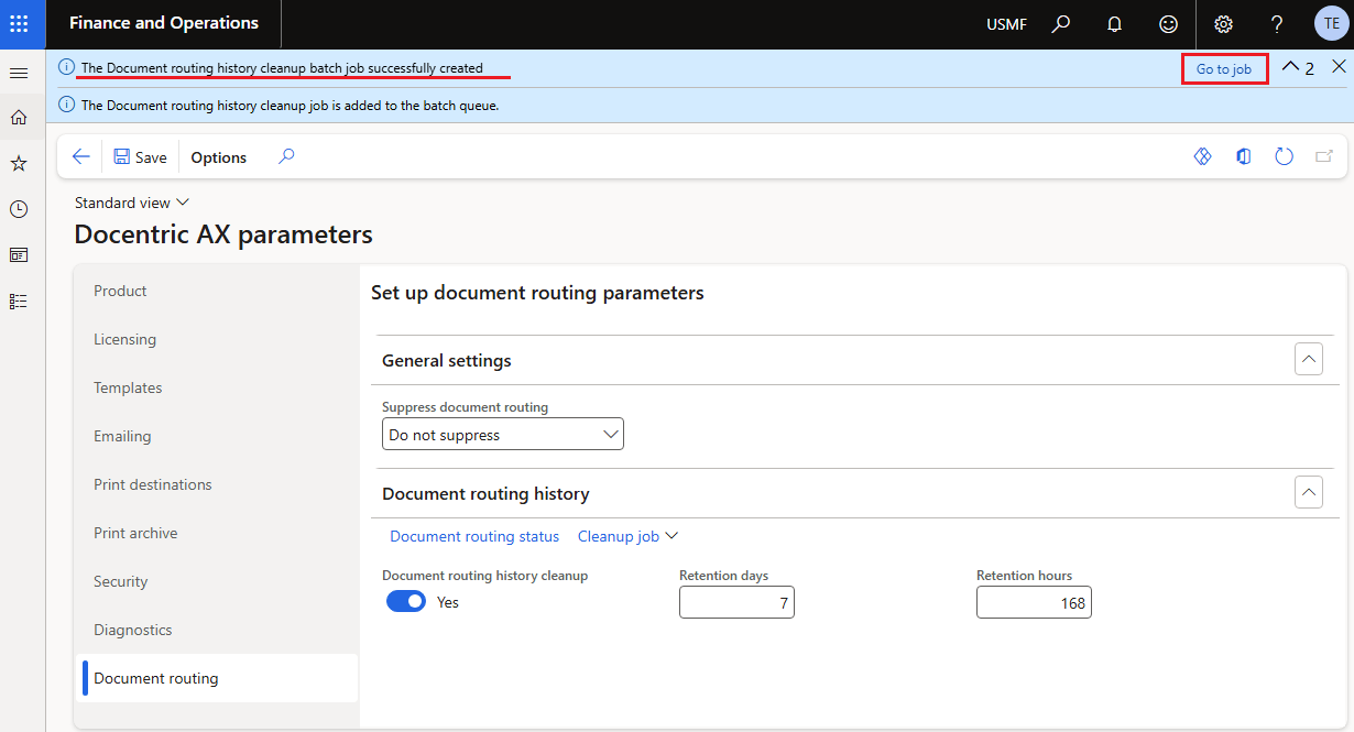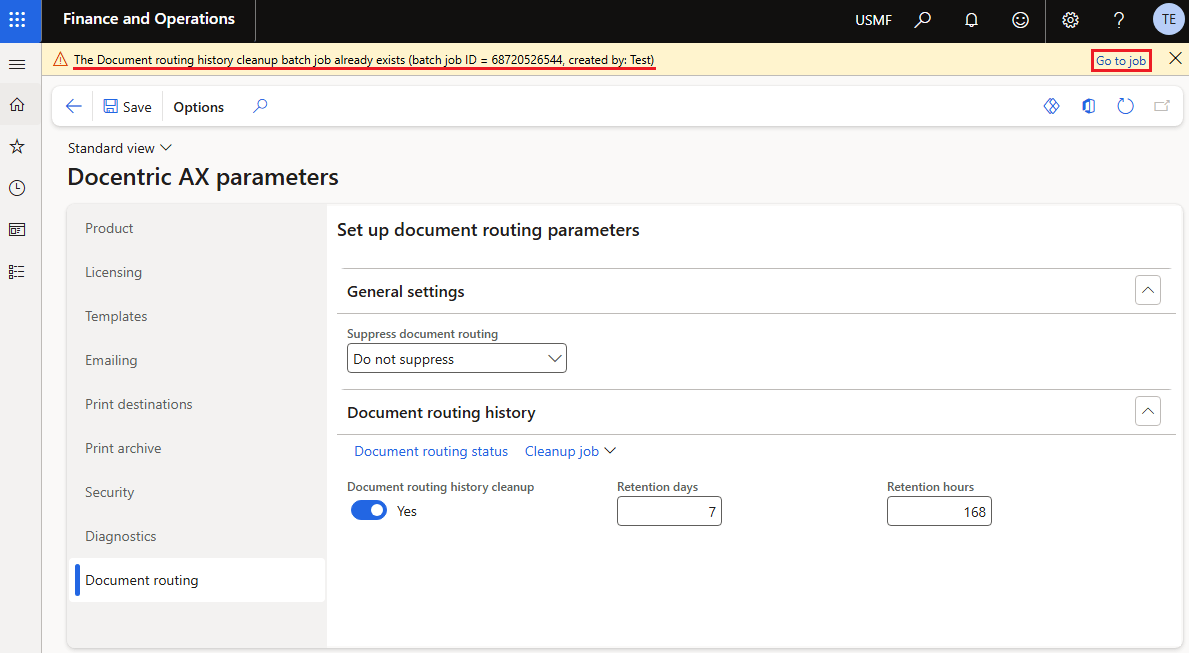 If the Document routing history cleanup batch job already exists, shows the corresponding Batch job ID and the name of the user who created the batch job in the infolog.