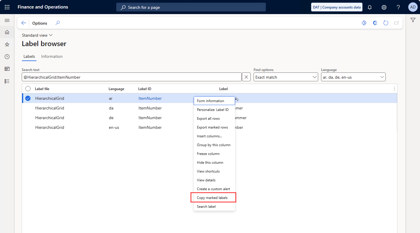 In the grid you will see the following fields: Label file, Language, Label ID, Label, Description and Global label ID.