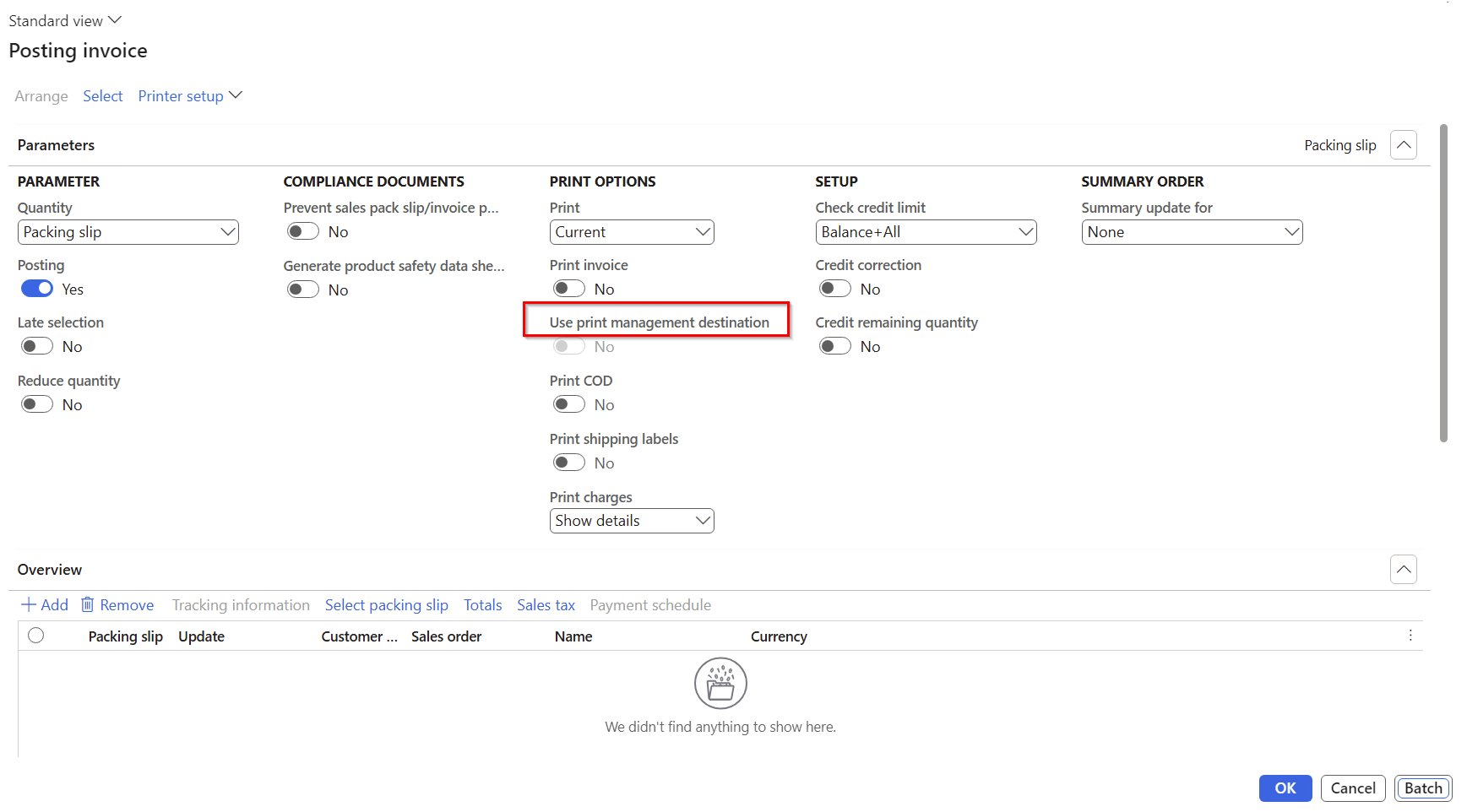 It seems that the batch job parameters were cached from some earlier setup, where Use print management destination was not active.
