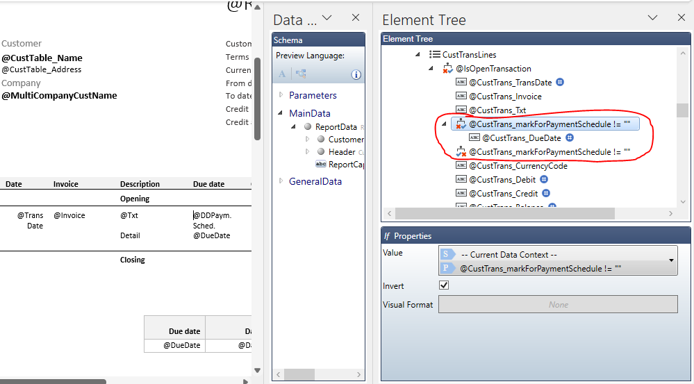Hi again Blaž, I have been playing around with our existing template in the meantime, and finally understand the existing expressions! Part of my confusion was because they are to evaluate CustTrans_markForPaymentSchedule against value “”, but in our data source it is always “”.