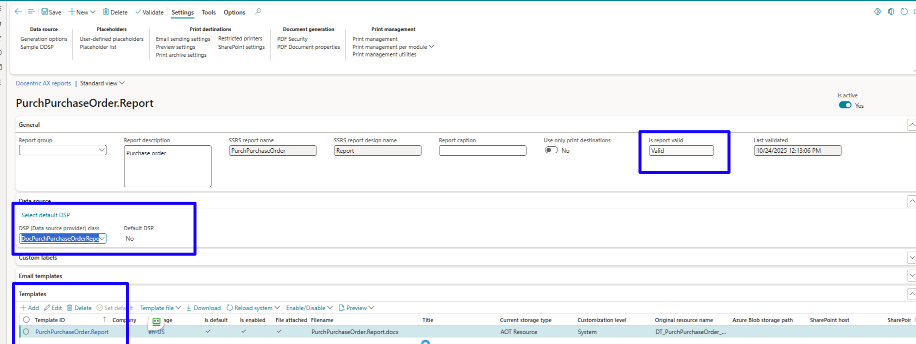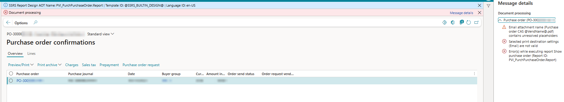 Please register PVI_PurchPurchaseOrder.Report in the Docentric reports table, configure it there, and then try again.