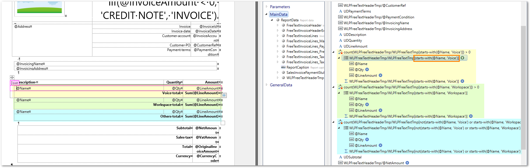 The ask changed to list all lines where WLPFreeTextHeaderTmp/WLPFreeTextTmp/@Name contains the words “Voice” and “Workspace” separately, each with subtotals. So assuming this will be two separate tables, I used a list with an iif function to only display the “Voice” lines. This however doesn’t work well with the Quantity or Amount fields as it’s picked up as a string and not a number. Is there a different way to separate the lines based on what the field starts with?