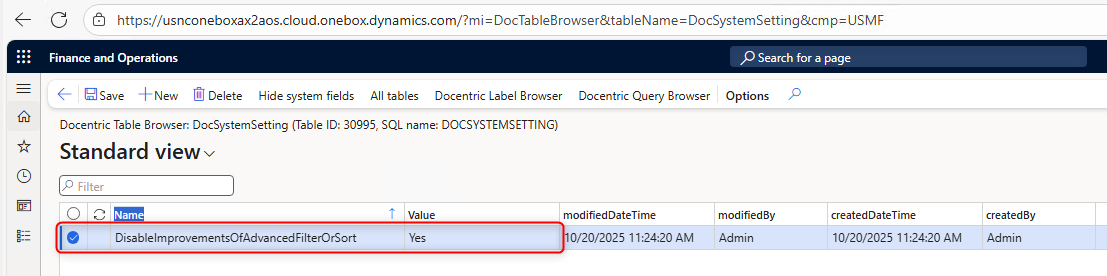 To fix this issue, you can add the DisableImprovementsOfAdvancedFilterOrSort parameter to the DocSystemSetting table and set its Value to Yes.