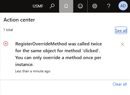 For this improvement, Docentric code calls the registerOverrideMethod(), which in some cases can be called twice (either because of customizations or standard code initializing the ActionPane twice), resulting in the aforementioned error:
