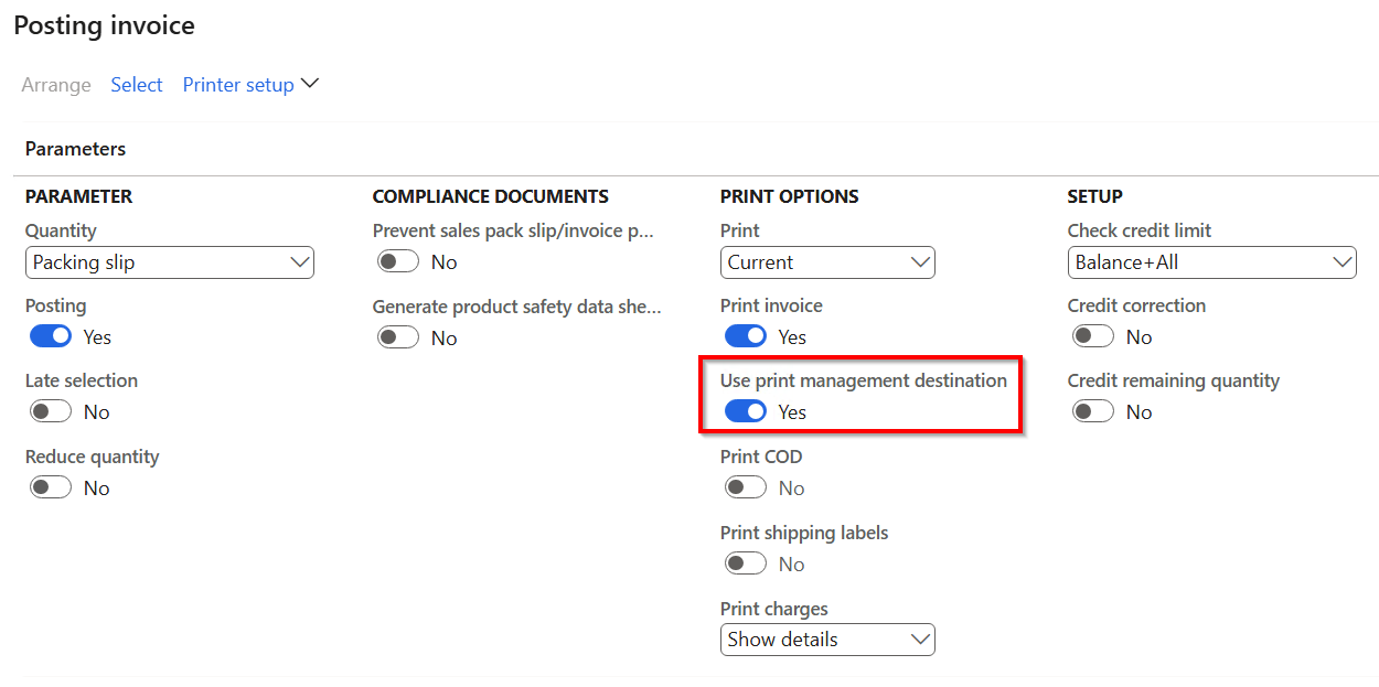 So, make sure that the Use print management destination flag on the posting form is enabled.