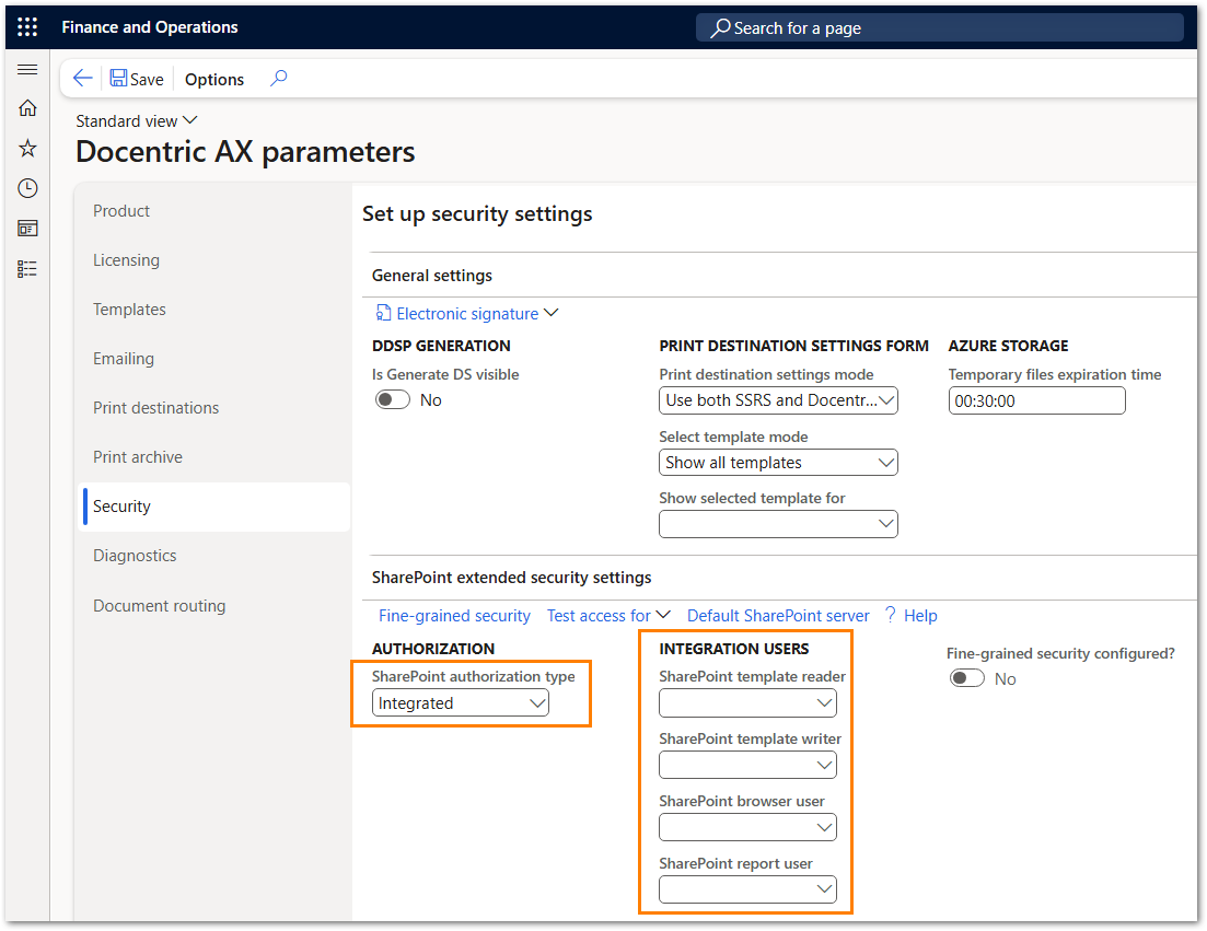 In that case you can set the Original print management setup to use Docentric Email print destination and a Copy print management setup to use Docentric File print destination and Save to SharePoint. When saving to SharePoint you may face some issues because Microsoft changed SharePoint access security and no longer allows impersonation. In Tier-2 environments you can use the Integrated security with empty INTEGRATION USERS fields. Each user, needing SharePoint access needs to have the access to SharePoint granted separately.