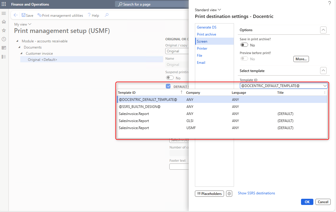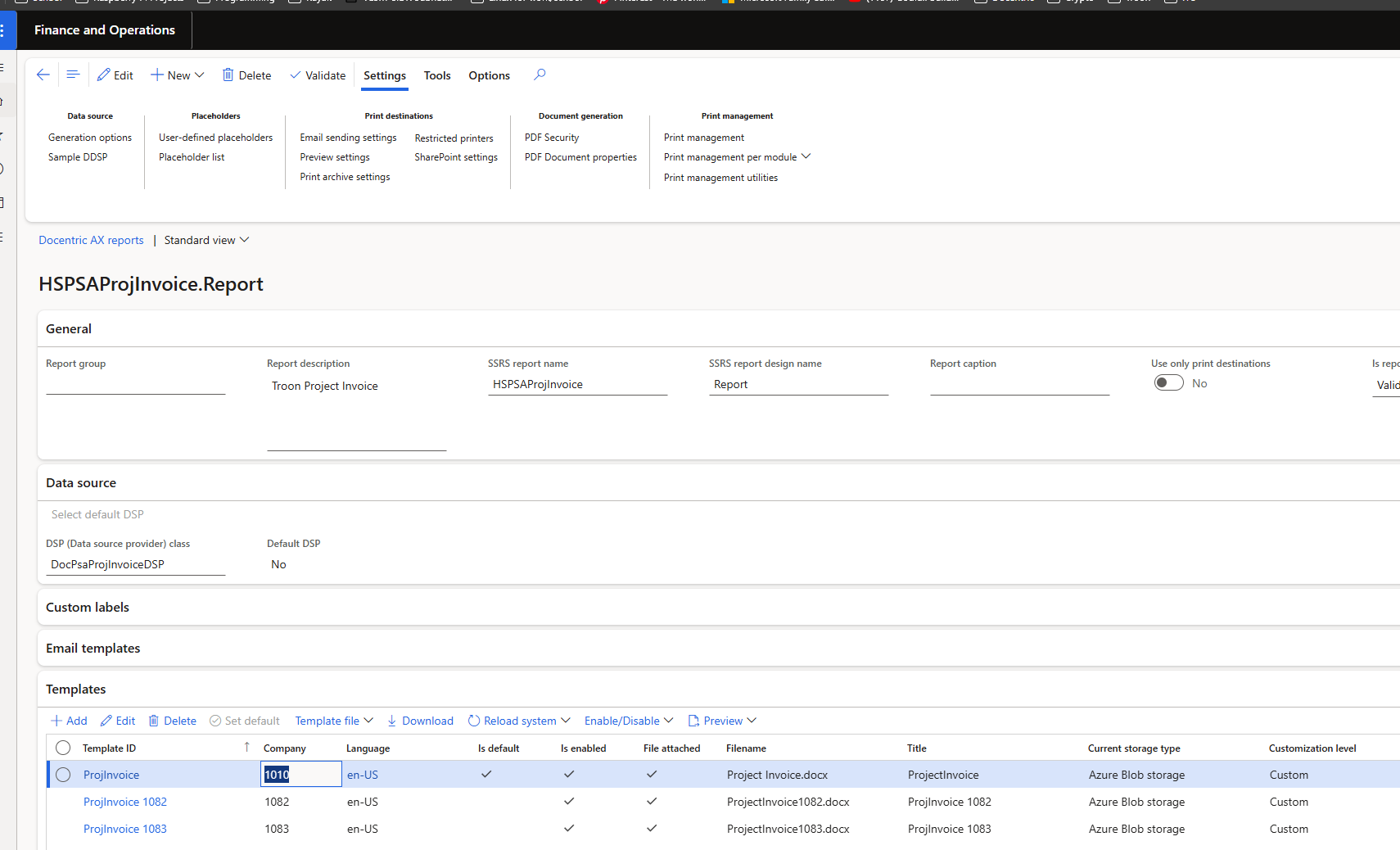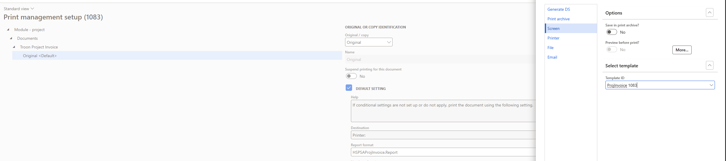 Attached is an image of our report templates. We need to only use the Proj Invoice template in 1083. But when we try to print using the original option, it only ever pulls the @Docentric_Default_Template@ no matter what is setup.
