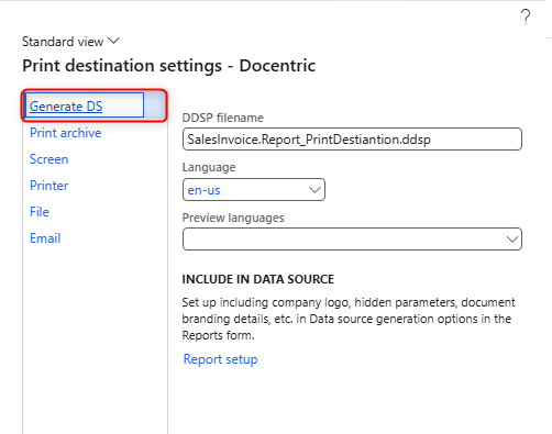 It defines which data is available and how it is structured, so the Docentric AX Designer knows what data can be used when building a report template. That version is called the design-time DDSP. It is the one you use when creating or updating a template.