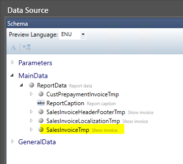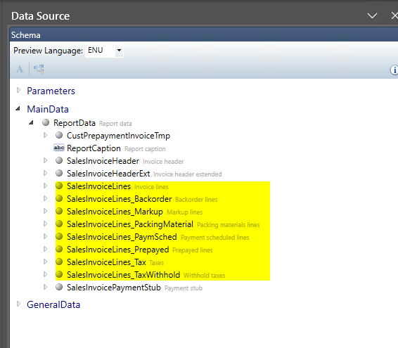 In standard SSRS reports, such as Sales Invoice or Purchase Order, several line types like transactions, taxes, prepayments, and charges are stored in one shared table called SalesInvoiceTmp. This setup works fine for developers but not for template designers who want to display each line type separately.