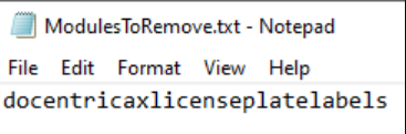 - In the file, put the name of the module to remove, in this case docentricaxlicenseplatelabels.
