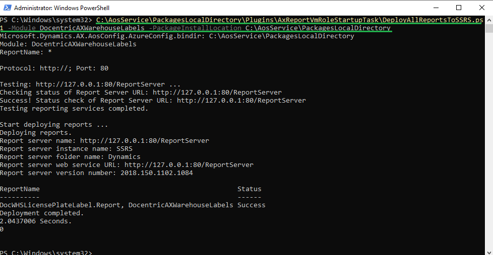 C:\AosService\PackagesLocalDirectory\Plugins\AxReportVmRoleStartupTask\DeployAllReportsToSSRS.ps1 -Module DocentricAXWarehouseLabels -PackageInstallLocation “C:\AosService\PackagesLocalDirectory”